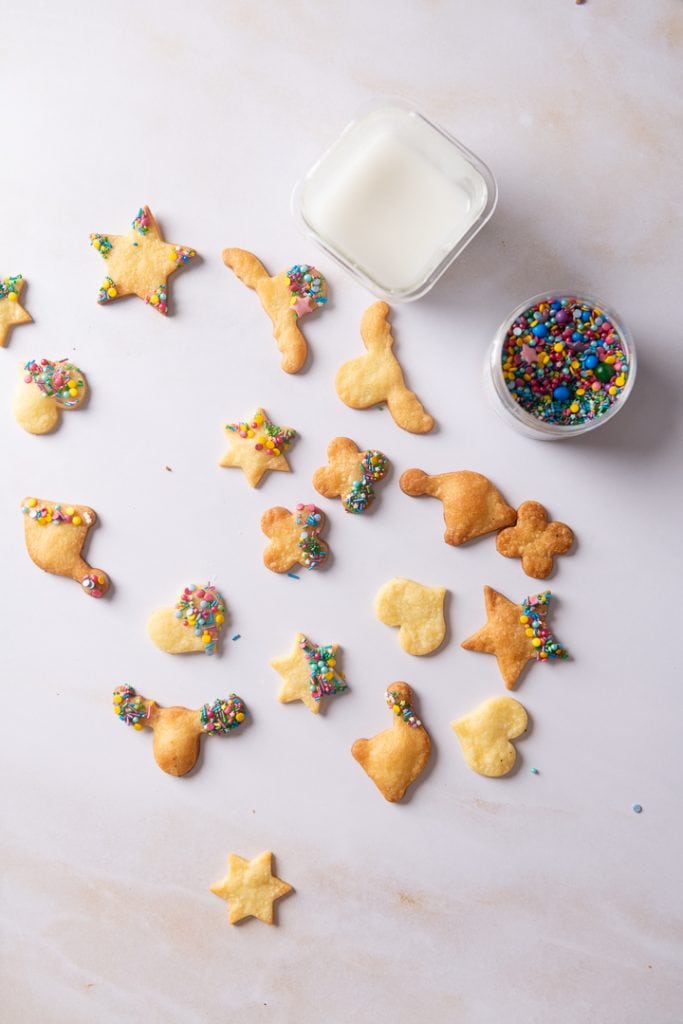 Dekoriere die Butterplätzchen ohne Ei nach dem Abkühlen mit Zuckerguss und bunten Streuseln.