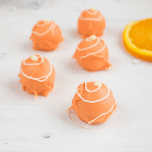 Pralinen in die oragene Schokolade geben und mit zwei Pralinengabeln oder mit zwei Kuchengabeln mit der Schokolade ummanteln und ein auf Pralinengitter setzen, kurz abtropfen lassen und zum vollständigen Trocknen auf ein Stück Backpapier setzen. Wenn die Schokolade etwas angetrocknet ist, mit dem Spritzbeutel mit der weißen Schokolade dekorieren.
