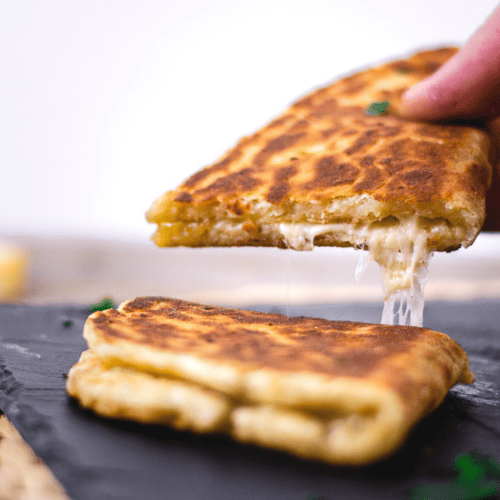 Eine Pfanne auf mittlerer Hitze erhitzen. Den geriebenen Käse auf die zwei Naan verteilen. Am Besten eignet sich frisch, selbst geriebener Bergkäse. Eine Kombination aus Emmentaler und Le Gruyere schmeckt vorzüglich.