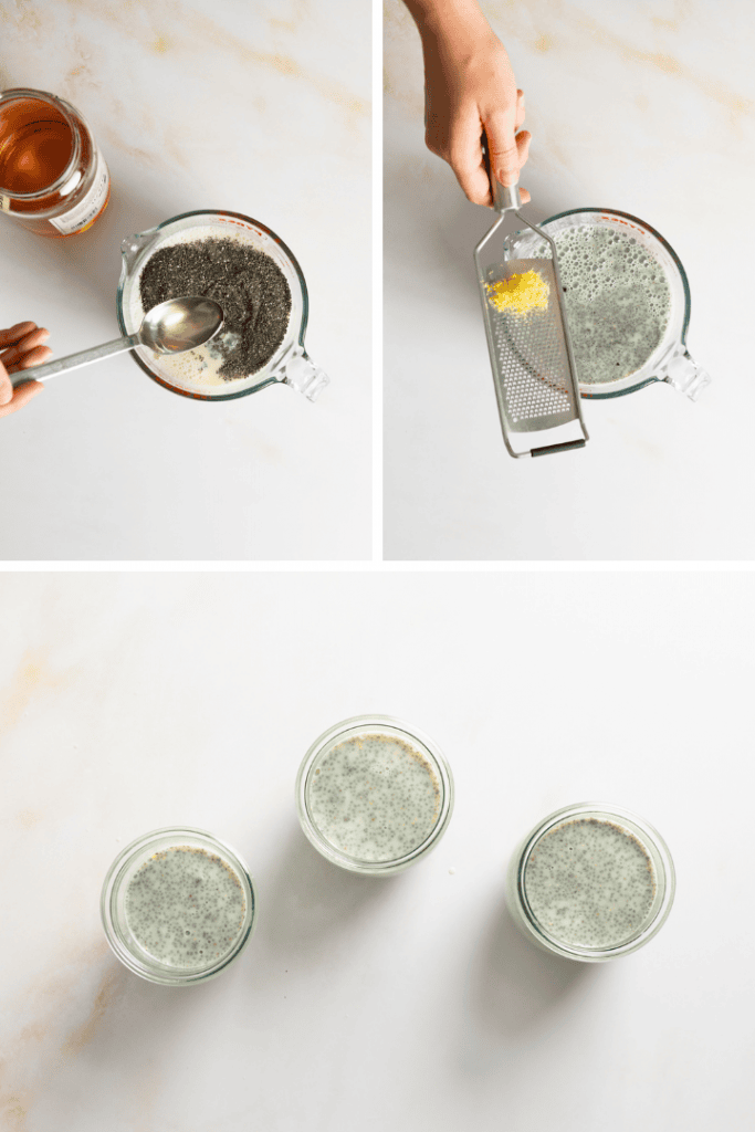 Vermenge die Chia Samen mit der Milch und gib Agavendicksaft und Zitronenabrieb dazu. Verteile die Mischung auf 3-4 Schälchen oder kleine Gläser.