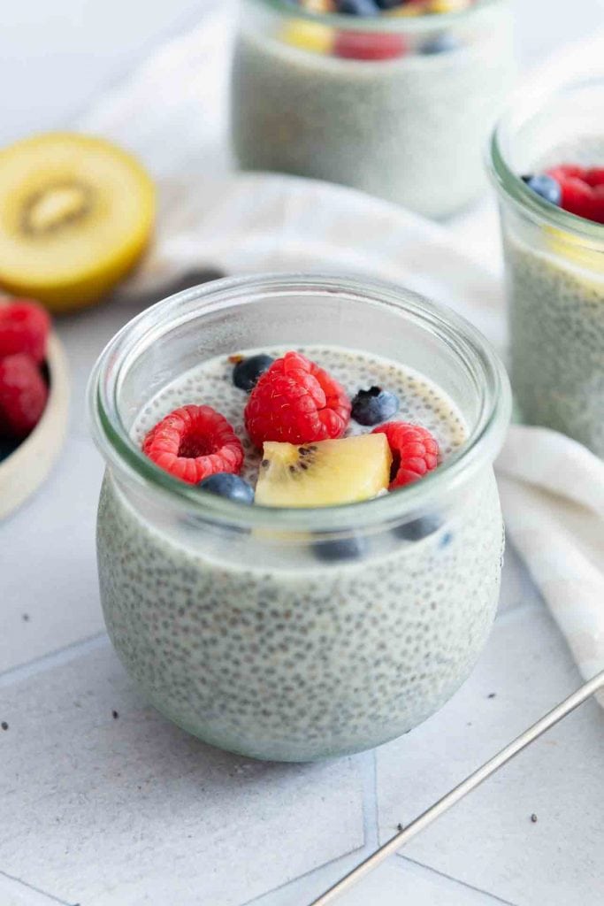 Dekoriere den fertigen Chia Pudding mit Milch mit Himbeeren, Heidelbeereo und Kiwi oder jedem anderen Obst dass du gerne isst.