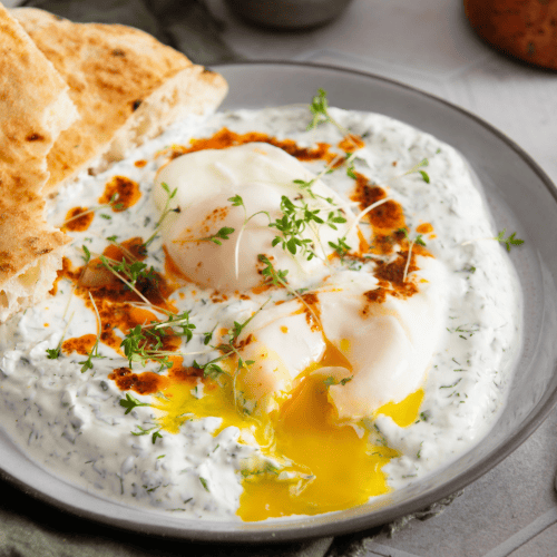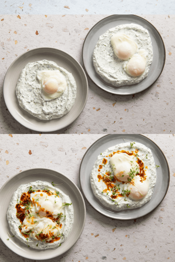 Verteile den Kräuterjoghurt auf zwei Teller. Lege jeweils zwei pochierte Eier auf jeden Teller und träufle die Chilibutter darüber. Garniere die türkische Eier mit Sprossen und serviere sie mit Weißbrot.
