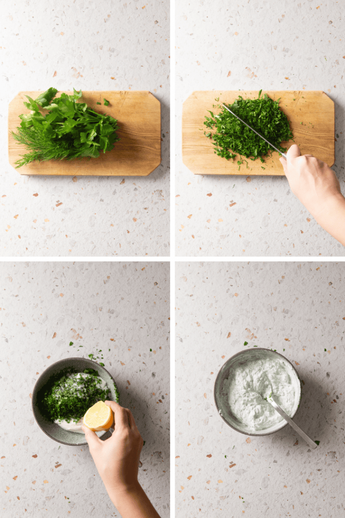 Gib den Joghurt in eine Schüssel. Hacke Dill und Petersilie sehr fein und reibe oder presse die Knoblauchzehe. Vermenge beides mit dem Joghurt und schmecke ihn mit Zitronensaft und Salz würzig ab.