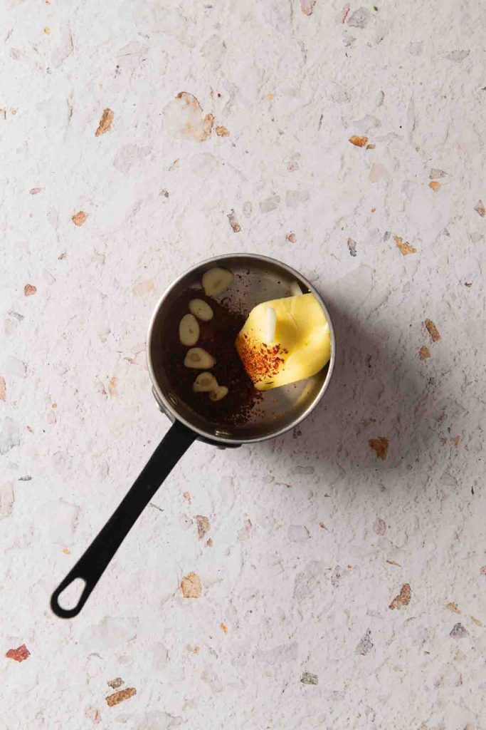 Schmilz die Butter in einem kleinen Topf. Gib Chiliflocken, Paprika und die zerkleinerte Knoblauchzehe dazu sowie das Salz. Erwärme die Mischung bis die Butter zu Sprudeln beginnt und nimm sie dann vom Herd.