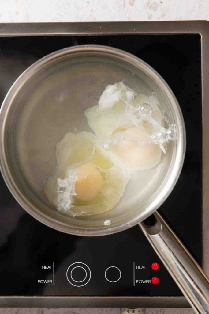 Bringe in einem Topf ca. 1-2 Liter Wasser zum köcheln. Schlage die Eier jeweils in eine kleine Tasse auf. Lass die Eier ins heiße Wasser gleiten und gare sie dort für ca. 5-7 Minuten, bis das Eiweiß fest, das Eigelb aber noch flüssig ist.