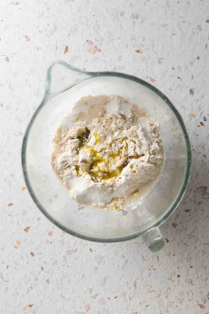 Gib das Weizenmehl in eine große Rührschüssel. Füge das Salz hinzu und vermenge die Zutaten kurz. Zerkrümle die Hefe und gib sie ebenfalls in die Schüssel. Gieße Wasser und Olivenöl dazu und verknete die Zutaten in der Küchenmaschine oder mit dem Handrührgerät etwa 10 Minuten bis ein geschmeidiger Teig entstanden ist, der nicht an der Schüssel oder an den Händen klebt.