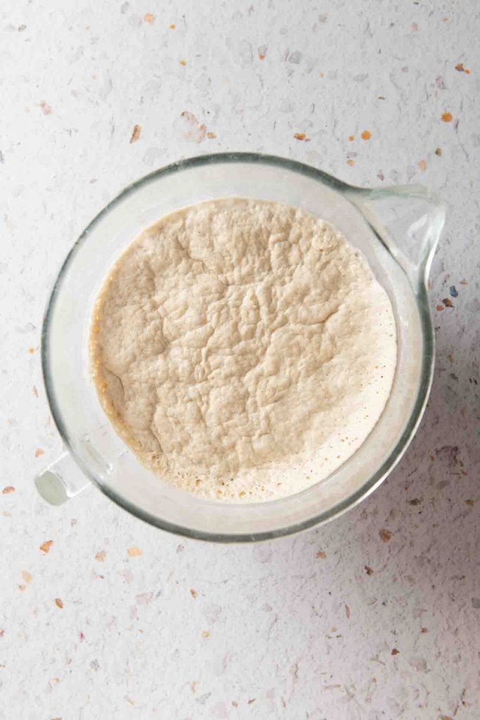 Lass den Hefeteig zugedeckt an einem warmen Ort ca. 30-60 Minuten aufgehen bis er sein Volumen verdoppelt hat.