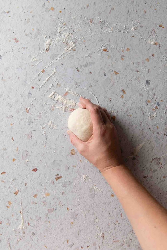 Hol den Teig aus der Schüssel, knete ihn kurz und teile ihn dann in 8 gleich große Portionen, die du jeweils zu einer Kugel formst.