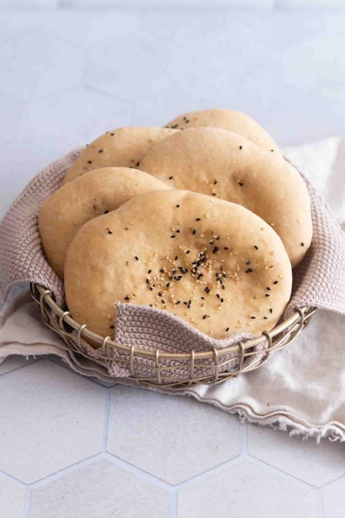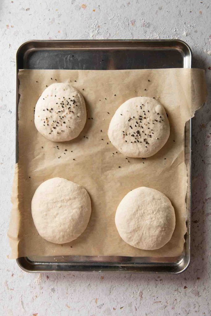 Drücke die Teigkugeln mit den Händen oder einem Nudelholz platt, sodass runde, etwa 2 cm dicke Teigfladen entstehen. Lege sie auf Backbleche mit etwas Abstand. Lass sie zugedeckt nochmal 30 Minuten aufgehen. Heize derweil den Backofen auf 170 °C Ober- und Unterhitze vor.