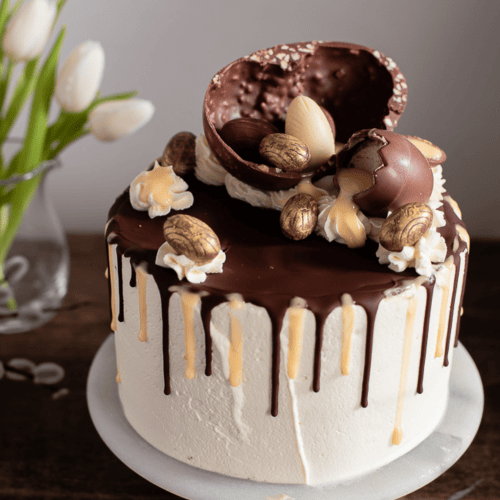 Die übrige Creme mit Hilfe eines Spritzbeutels mit Sterntülle auf der Oberseite der Torte dekorieren. Torte mit verschiedenen Schoko-Ostereiern und etwas Eierlikör garnieren. Bis zum Servieren in den Kühlschrank stellen.