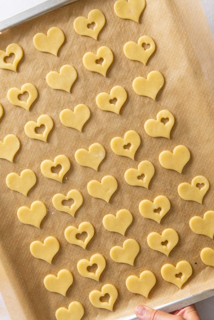 Setze die ausgestochenen Plätzchen auf ein Backblech mit Backpapier. Stich aus der Hälfte der Plätzchen ein kleineres Herz aus.