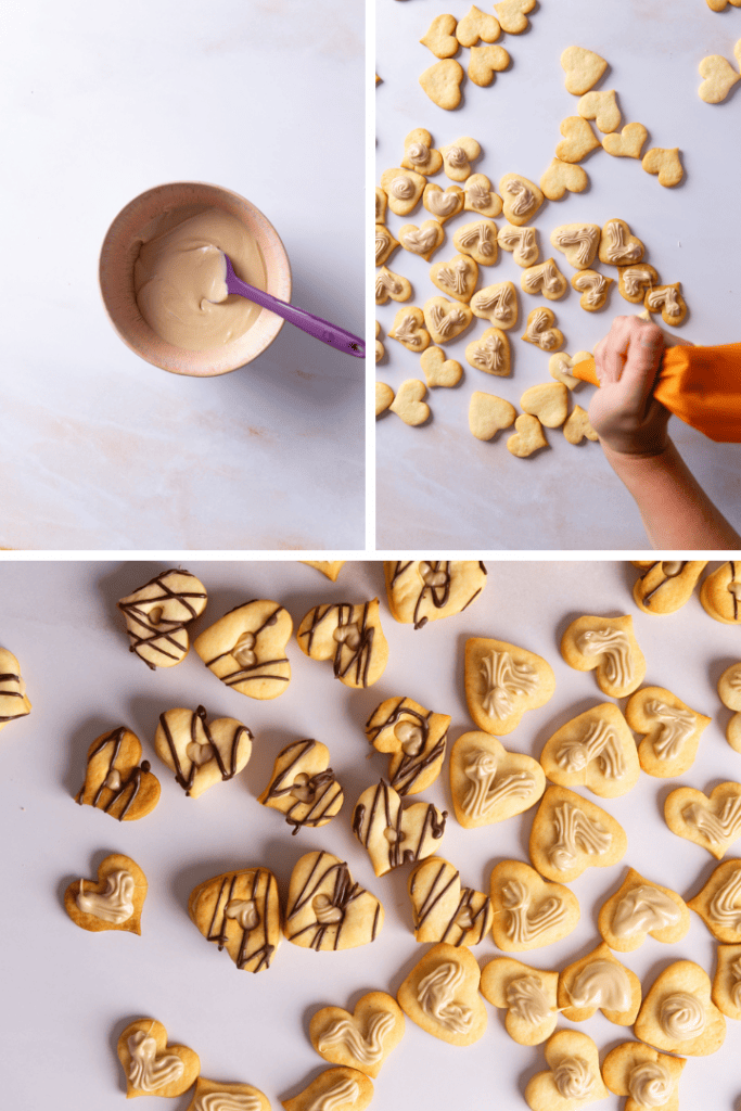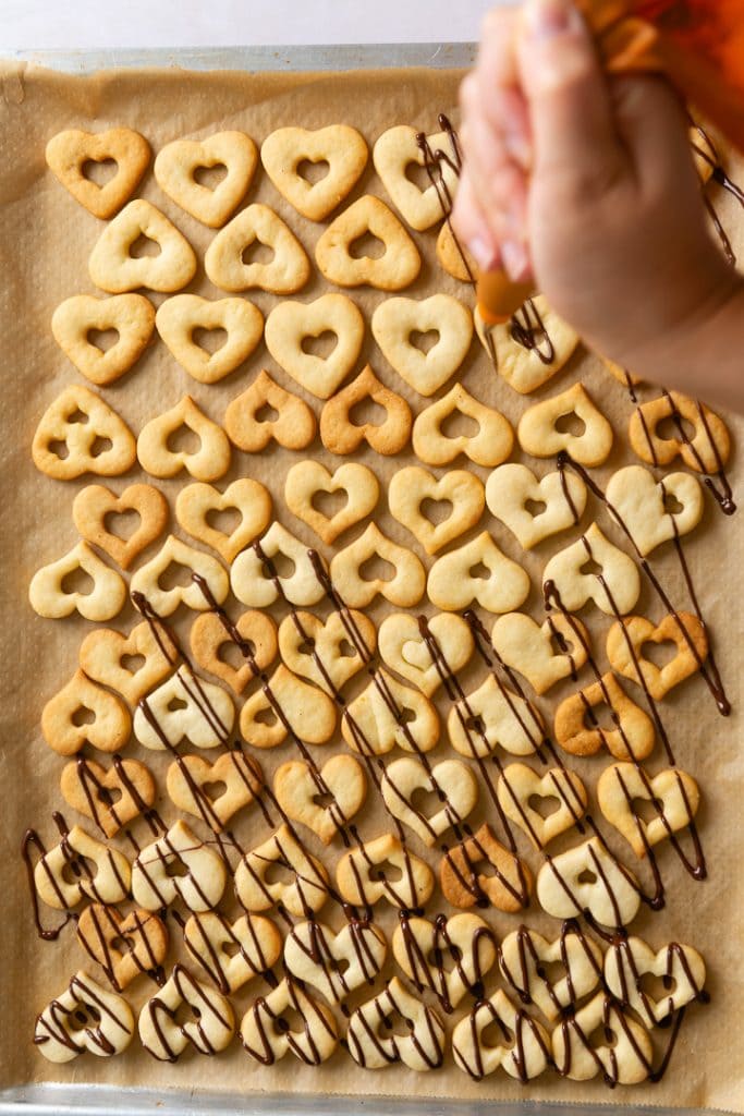 Lege die Oberteile (mit Loch) der Nougatherzen auf ein Backblech. Schmilz die Schokolade auf dem Wasserbad oder in der Mikrowelle und gib sie in Schlieren über die Plätzchen-Oberteile. Lass sie trocknen, bevor du weitermachst.