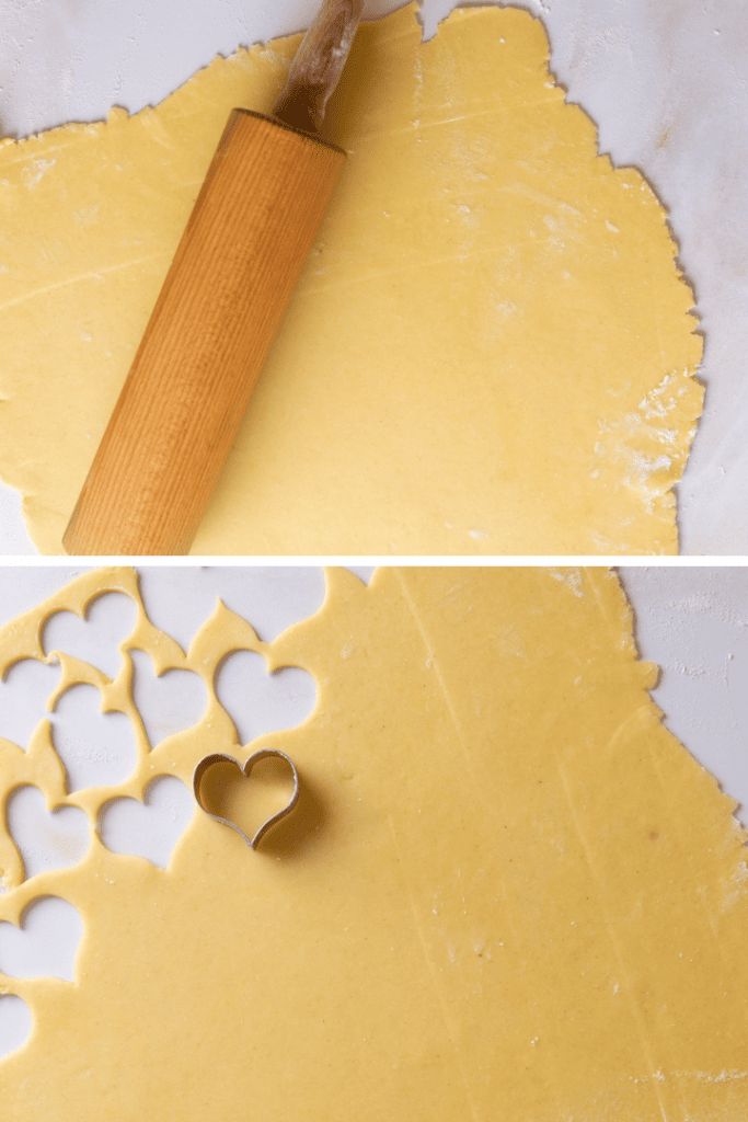 Knete den Teig kurz etwas geschmeidig und rolle ihn auf einer bemehlten Arbeitsfläche etwa 3 mm dick aus. Stich Herzen aus dem Teig aus.