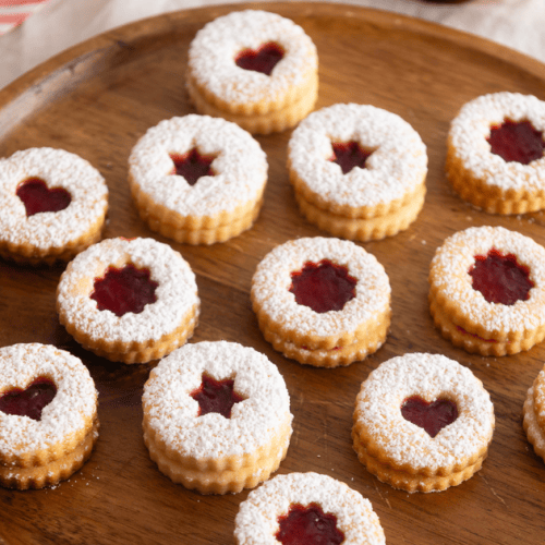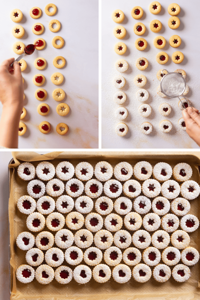 Fülle die Spitzbuben nach dem Abkühlen mit Johannisbeergelee und bestreue sie mit etwas Puderzucker. Lass sie vor dem Verpacken in eine Blechdose etwa 1 Stunde trocknen.