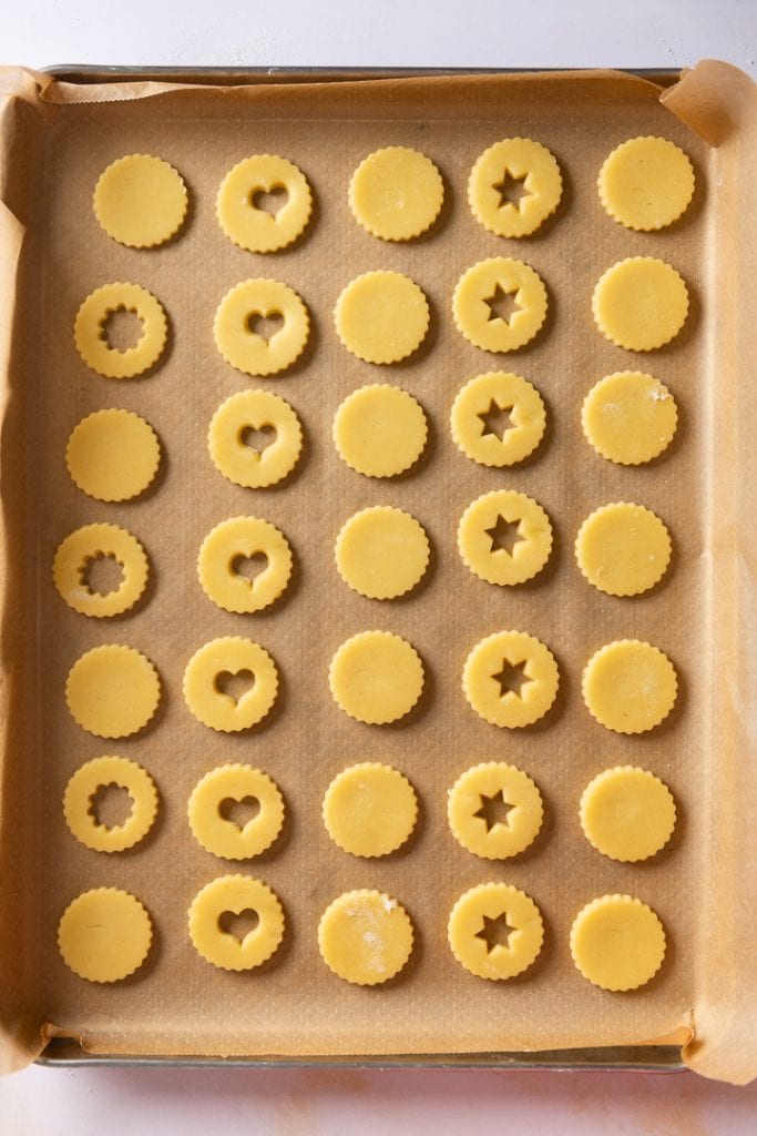 Setze die ausgestochenen Plätzchen auf ein Backblech mit Backpapier. Stich aus der Hälfte der Plätzchen ein kleines Loch aus. Sehr gut eignen sich dafür kleine Herzen, Sterne oder Blumen Ausstecher.