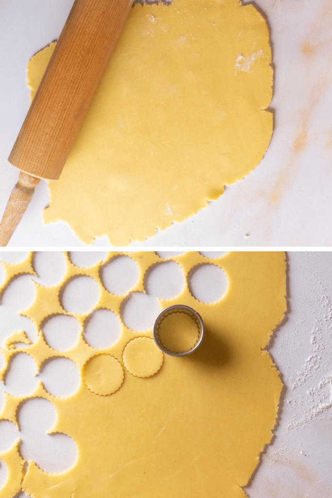 Knete den Teig kurz etwas geschmeidig und rolle ihn auf einer bemehlten Arbeitsfläche etwa 3 mm dick aus. Stich beliebige Formen für die Spitzbuben aus. Klassisch sind Taler, aber auch Herzen und Sterne sehen hübsch aus.