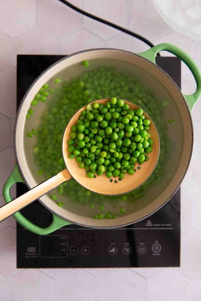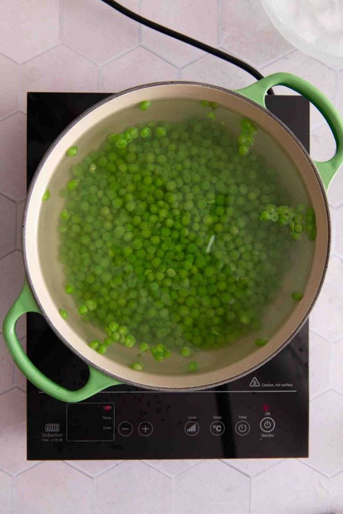 Bringe 2 Liter Wasser zum Kochen und rühre 50 g Zucker und 60 g Salz ein. Blanchiere dann 900 g Erbsen darin. Frische Erbsen brauchen 5-8 Minuten, gefrorene Erbsen sind in 4-5 Minuten fertig. Ziel ist, das sie Erbsen eine intensive leuchtend grüne Farbe haben.Hinweis: Du brauchst die gefrorenen Erbsen vorher nicht auftauen lassen.