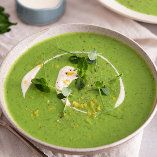 Du kannst die Suppe ohne Weiteres einen Tag vorher vorbereiten und im Kühlschrank lagern. Sie ist schmeckt an heißen Tagen wunderbar als kaltes, leichtes Mittagessen, ist aber auch warm sehr lecker. Ach einfrieren kannst du die Erbsensuppe mit Minze sehr gut. Sie hält ohne Weiteres 2-3 Monate im Eisfach.