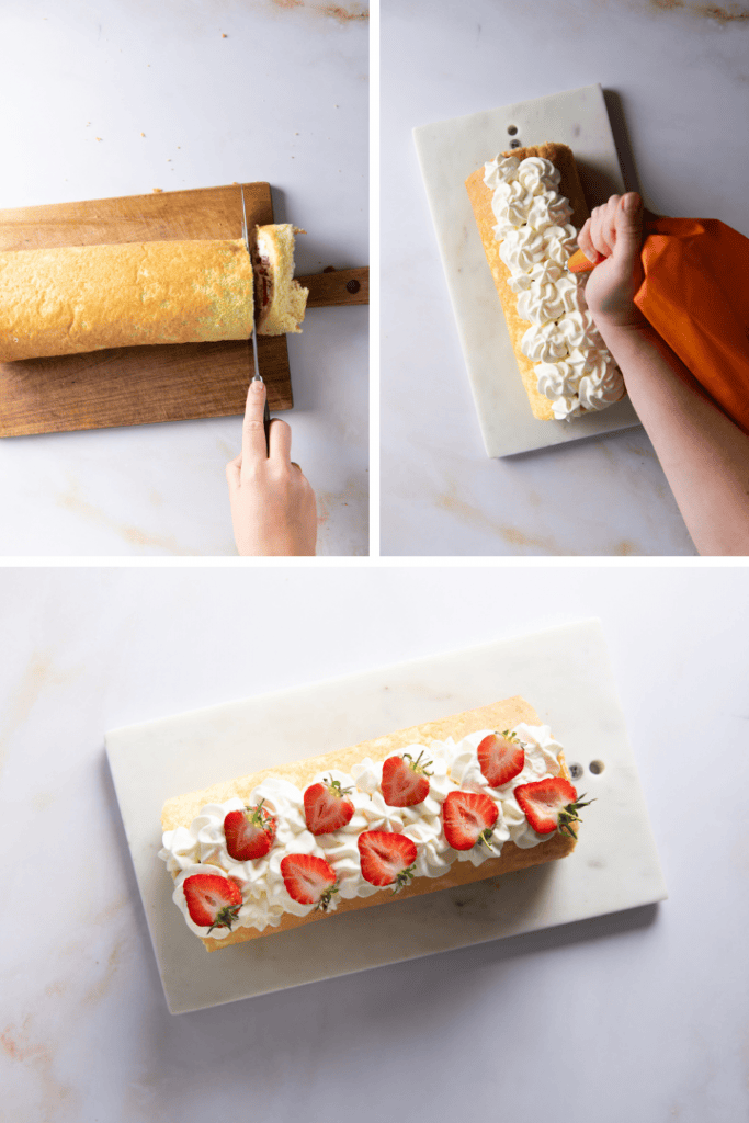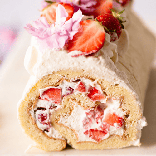 Anfang und Ende der Rolle mit einem scharfen Messer begradigen und die Rolle auf einer Kuchenplatte oder einem schönen Teller umsetzen. Die restliche Sahne in einen Spritzbeutel geben und die Rolle damit dekorieren. Der Rolle mit Erdbeeren, essbaren Blüten und Blättern dekorieren und bis zum servieren im Kühlschrank aufbewahren.
