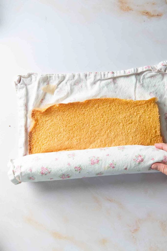 Den Teig nach dem Backen sofort auf einvorbereitete Geschirrtuch stürzen. Das Backpapier abziehen und von der langen Seite her, so eng es geht, mit dem Geschirrtuch aufrollen. So komplett abkühlen lassen.