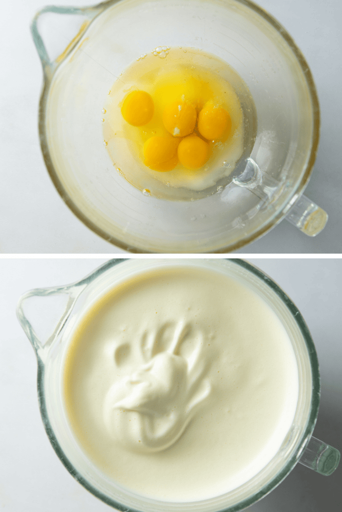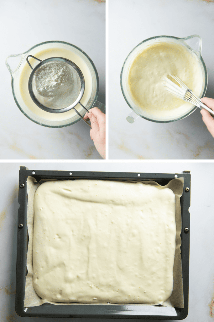 Backofen auf 170 °C Ober- und Unterhitze vorheizen. Ein Backblech mit Backpapier auslegen. Eier trennen. Eiweiß in einer sauberen Schüssel mit einer Prise Salz steif schlagen. In einer zweiten Schüssel die Eigelb mit dem Zucker und dem heißen Wasser vermischen. Aufschlagen bis die Masse weißschaumig ist.