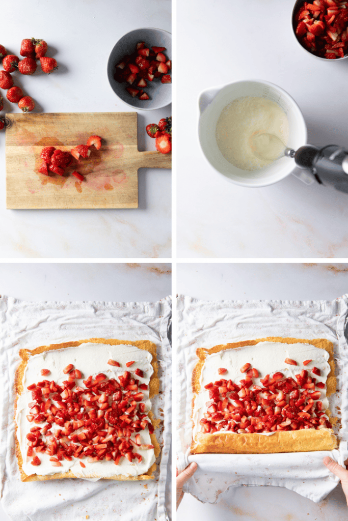 Sobald die Biskuitrolle kalt ist die Erdbeeren würfeln. Sahne mit Puderzucker und Vanilleextrakt vermischen und steif schlagen. Die Biskuitrolle wieder ausrollen, mit ⅔ der Sahne bestreichen. Am äußeren Rand der Rolle einen etwa 3 cm breiten Streifen nicht mit Sahne bestreichen. Erdbeeren auf der Sahne verteilen. Mit Hilfe des Geschirrtuchs wieder einrollen.
