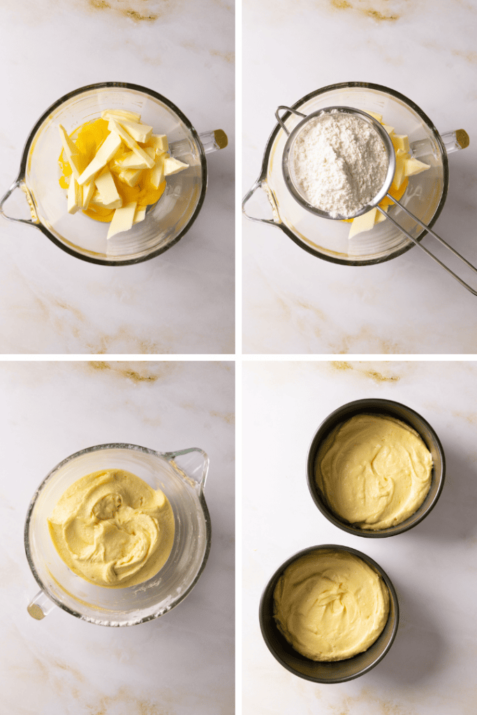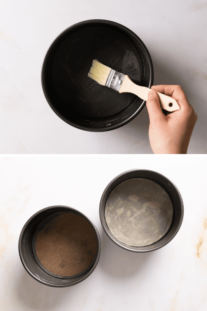 Backofen auf 170 °C Ober- und Unterhitze vorheizen und zwei Backformen mit je 18 cm Durchmesser mit Butter ausstreichen und Böden mit Backpapier belegen.