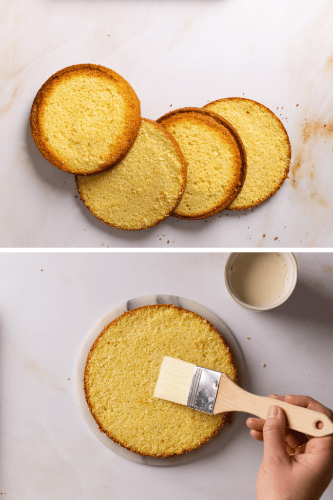 Böden nach dem Backen komplett abkühlen lassen. Dann Horizontal halbieren und mit etwas Milch tränken.