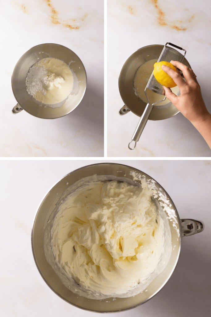Für die Creme Mascarpone, Puderzucker und Schlagsahne mit dem Handrührgerät oder der Küchenmaschine vermischen. Den Zitronensaft und die Zitronenschale sowie Vanilleextrakt dazu geben. So lange aufschlagen, bis die Creme standfest ist.