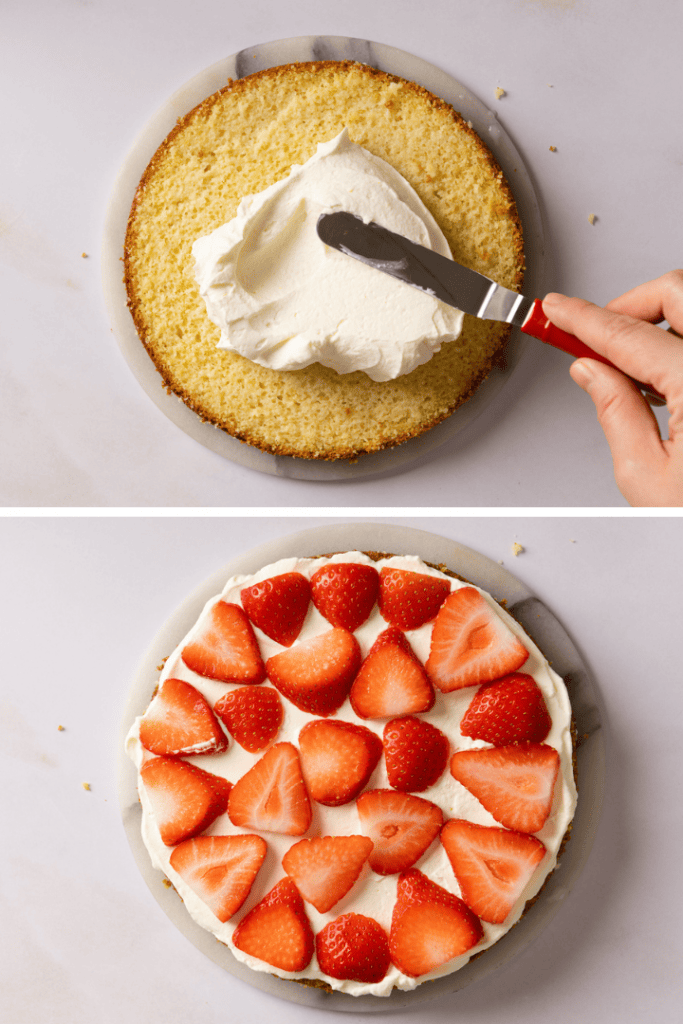 Boden erst mit ca. 3 EL Creme bestreichen, dann die Erdbeerscheiben darauf verteilen und die Erdbeeren nochmal mit einer dünnen Schicht Creme bedecken. Dann den nächsten Boden darauf setzen.