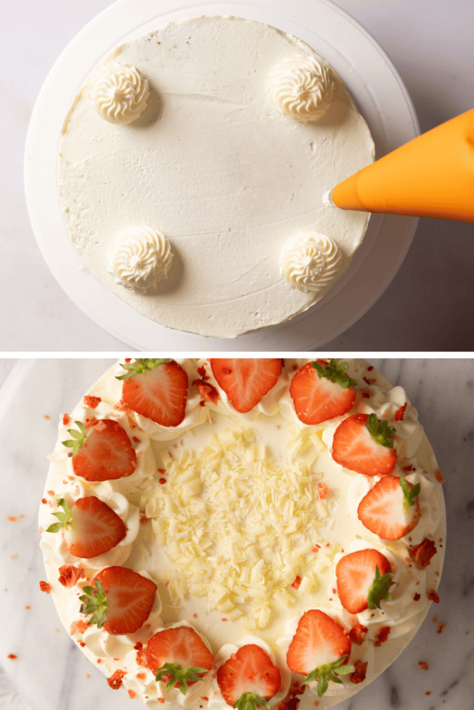 Die zweite Schicht der Creme auftragen und der Torte ein glattes Finish verleihen. Mit der Erdbeermarmelade einige Kleckse auf den Seiten der Torte verteilen und nochmals glatt streichen. Dadurch erhält die Torte die rosa Schlieren. Torte mit der restlichen Creme, weißer Schokolade und Erdbeeren dekorieren. Bis zum Servieren kalt stellen.