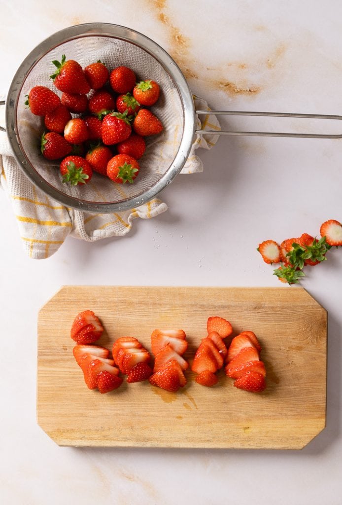 Die Erdbeeren in ca. 3 mm dicke Scheiben schneiden.
