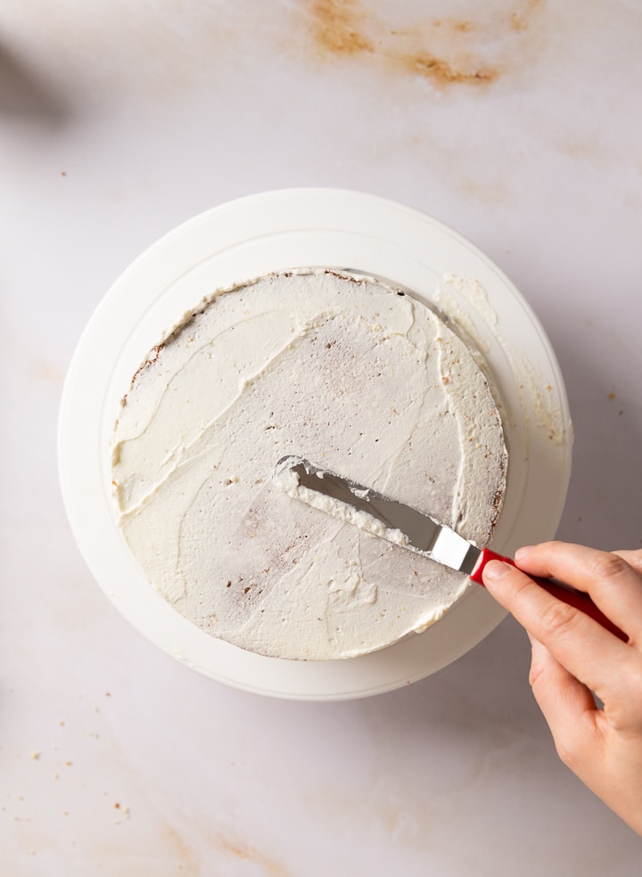 Nach dem Füllen die Torte mit einer dünnen Schicht aus Creme überziehen um die Krümel einzuschließen. Torte für ca. 40 Minuten kühlen.