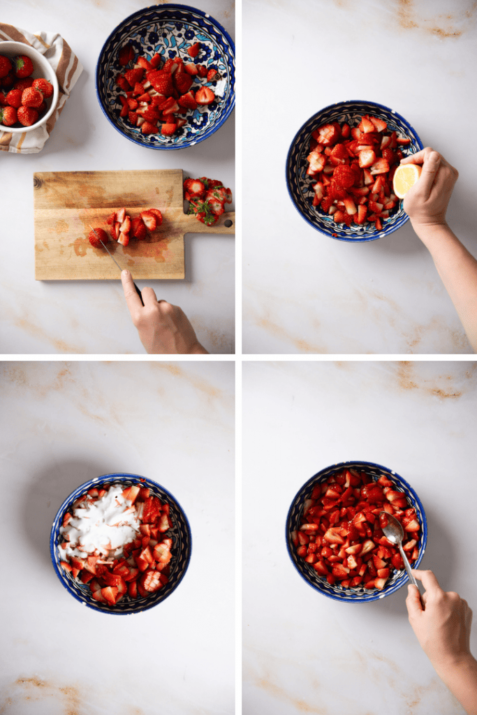 Wasche und putze die Erdbeeren. Viertle sie und vermenge sie dann mit Zucker und Zitronensaft. Lass die Erdbeeren mindestens 30 Minuten, besser 1-2 Stunden ziehen.