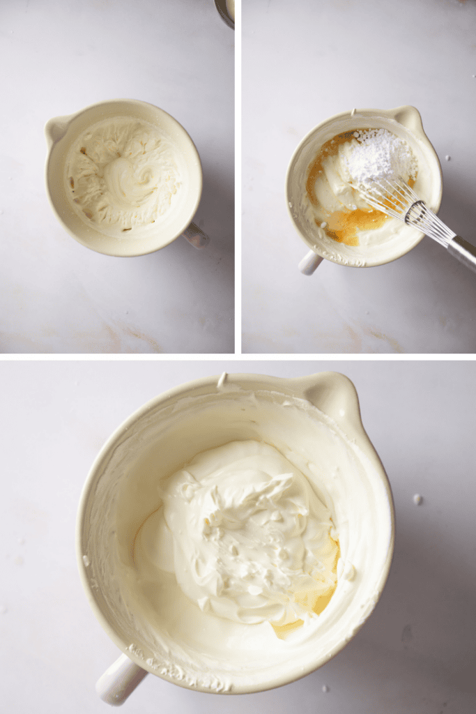 Schlage die Schlagsahne steif auf, rühre Mascarpone, Quark, Puderzucker, Zitronensaft und Vanilleextrakt unter.