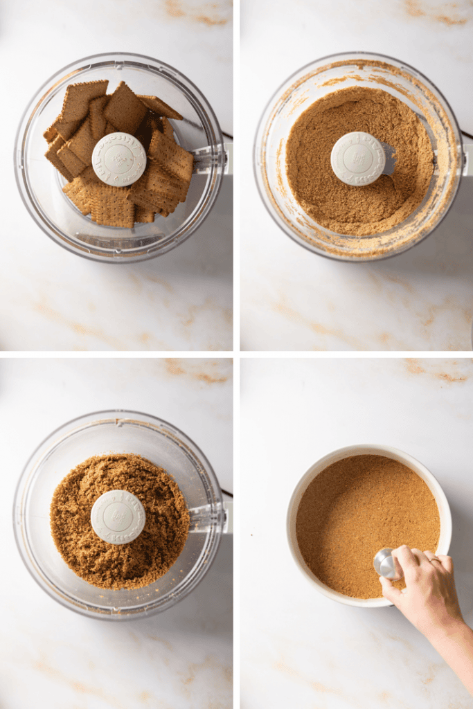 Zerkrümle die Butterkekse. Das geht in einem Food Processor sehr gut, du kannst die Kekse aber auch in einen Gefrierbeutel füllen und sie mit einem Nudelholz zertrümmern. Mische dann die geschmolzene Butter unter die Keksbrösel. Fülle die Mischung in eine Backform mit 26 cm Durchmesser und drücke den Keksboden gut fest.