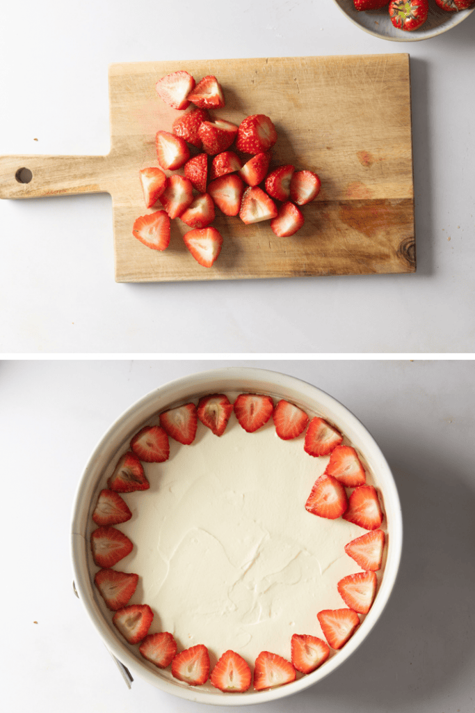 Einfaches Rezept für Erdbeerkuchen ohne Backen mit knusprigem Keksboden. Die Zubereitung dieses Kuchens dauert nur ein paar Minuten. Ideal für heiße Sommertage und zum Vorbereiten.