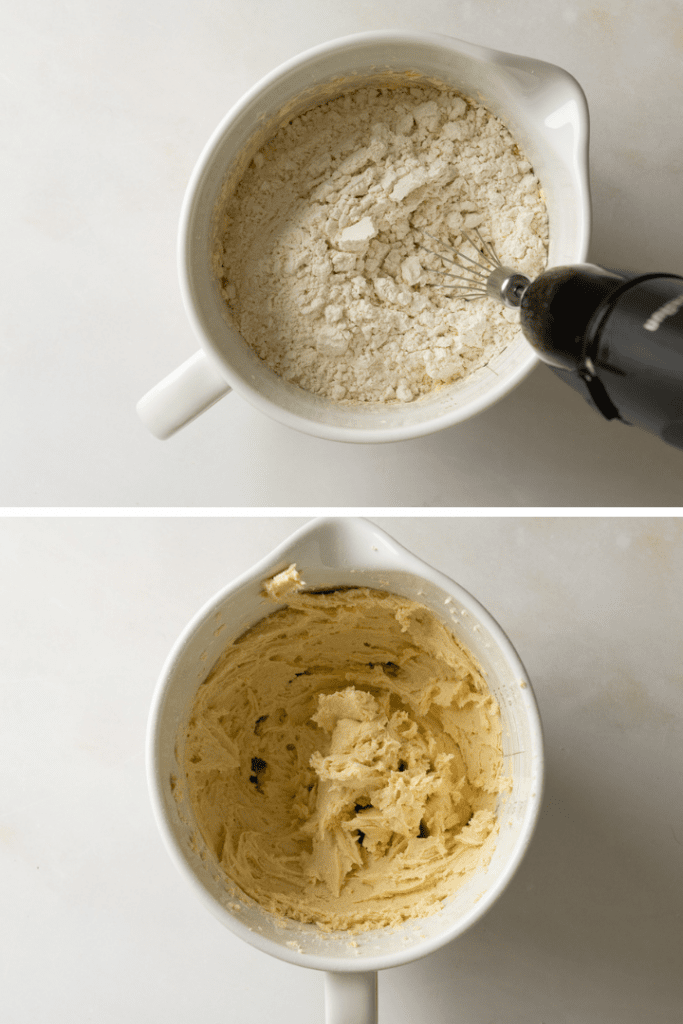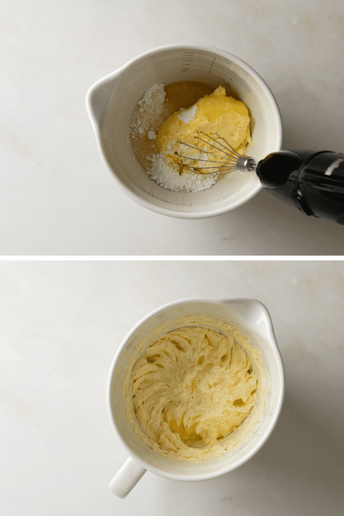 230 g Butter, 90 g Puderzucker und 2 TL Vanilleextrakt in eine Rührschüssel geben. Eine Prise Salz zufügen und mit dem Handrührgerät oder dem Schneebesen der Küchenmaschine aufschlagen, bis die Masse hell und fluffig ist.