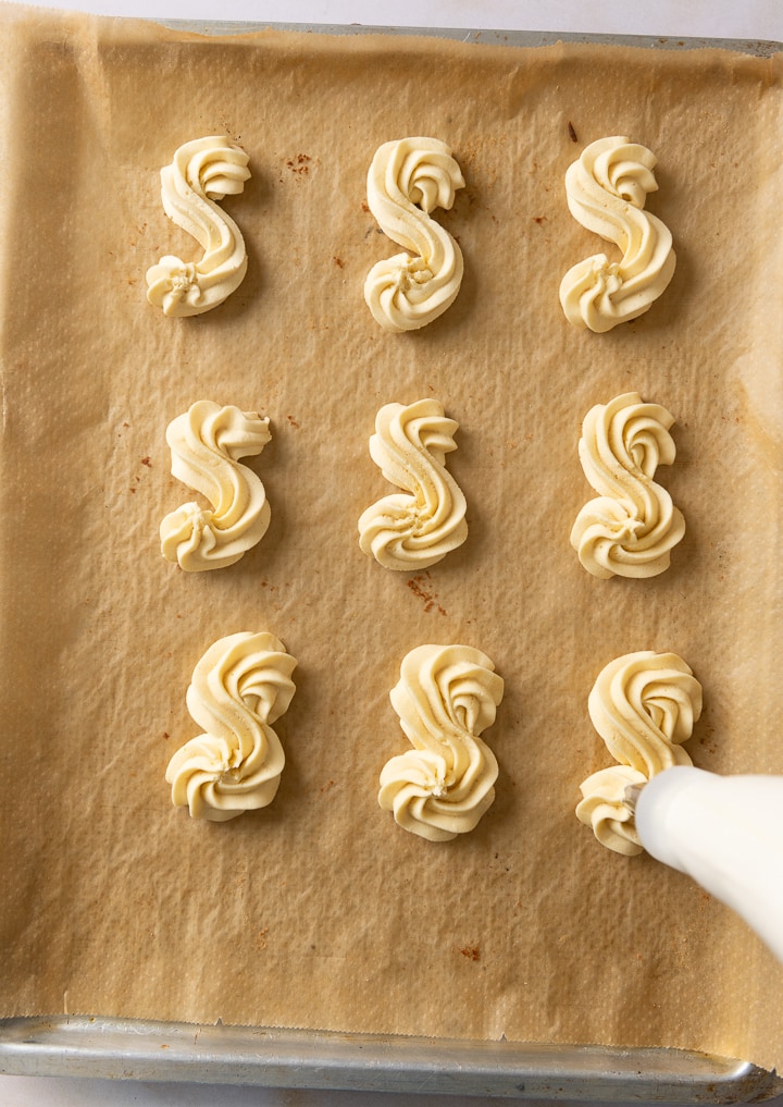 Spritze den Teig nun in Kringeln, S-Form oder U-Form auf ein Backblech mit Backpapier und backe das feine Butter Spritzgebäck im vorgeheizten Backofen für ca. 12-15 Minuten bis es beginnt, goldbraun zu werden.