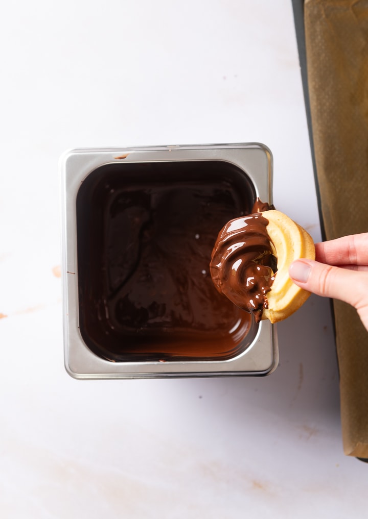 Schmilz 140 g der Schokolade, gib dann die restlichen 60 g Schokolade dazu und temperiere die Schokolade auf diese Weise. Tunke das abgekühlte Butter Spritzgebäck in die Schokolade und lass es gut trocknen.