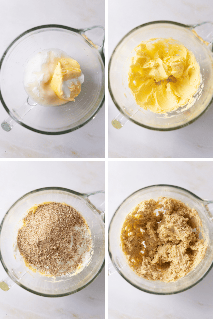 Gib Butter, Zucker und Vanilleextrakt und Salz in eine Rührschüssel und rühre die Zutaten kurz cremig. Füge dann das Mehl und die gemahlenen Nüsse dazu und verrühre alles zu einem glatten Teig.