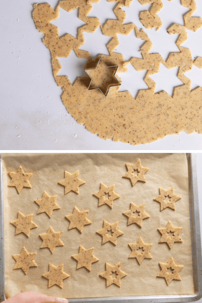 Stich Herzen, Sterne oder Taler aus dem Teig aus und lege sie vorsichtig auf Backbleche mit Backpapier und backe sie für ca. 7-10 Minuten im vorgeheizten Backofen bis sie goldbraun werden.Wichtig: Lass die Nuss Krapferl auf dem Backblech liegen, bis sie ganz abgekühlt sind. Erst dann sind die Plätzchen stabil genug, um sie umzusetzen.