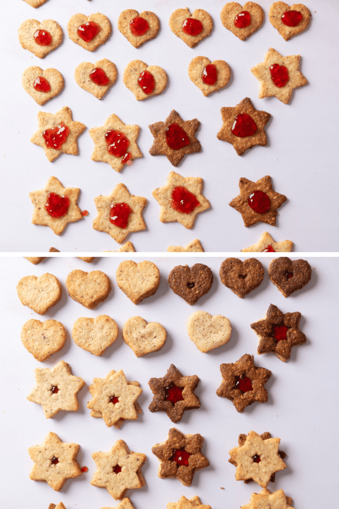 Gib einen Klecks Johannisbeergelee auf die Hälfte der Plätzchen und lege je einen Oberteil darauf. Bestäube die zusammengeklebten Plätzchen mit etwas Puderzucker und lass sie vor dem Verpacken in die Keksdose etwa 2 Stunden lang trocknen.