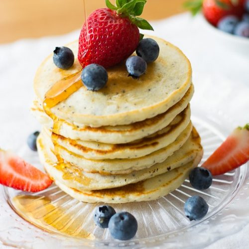 Die fertigen Pancakes mit Ahornsirup, frischen Früchten und Joghurt servieren.