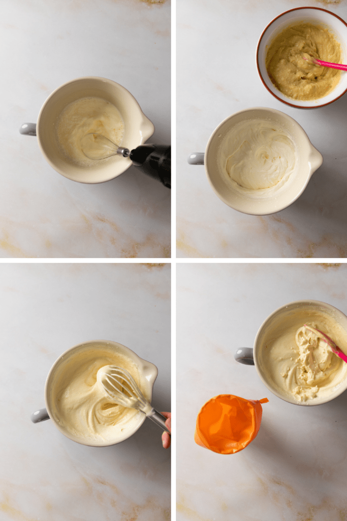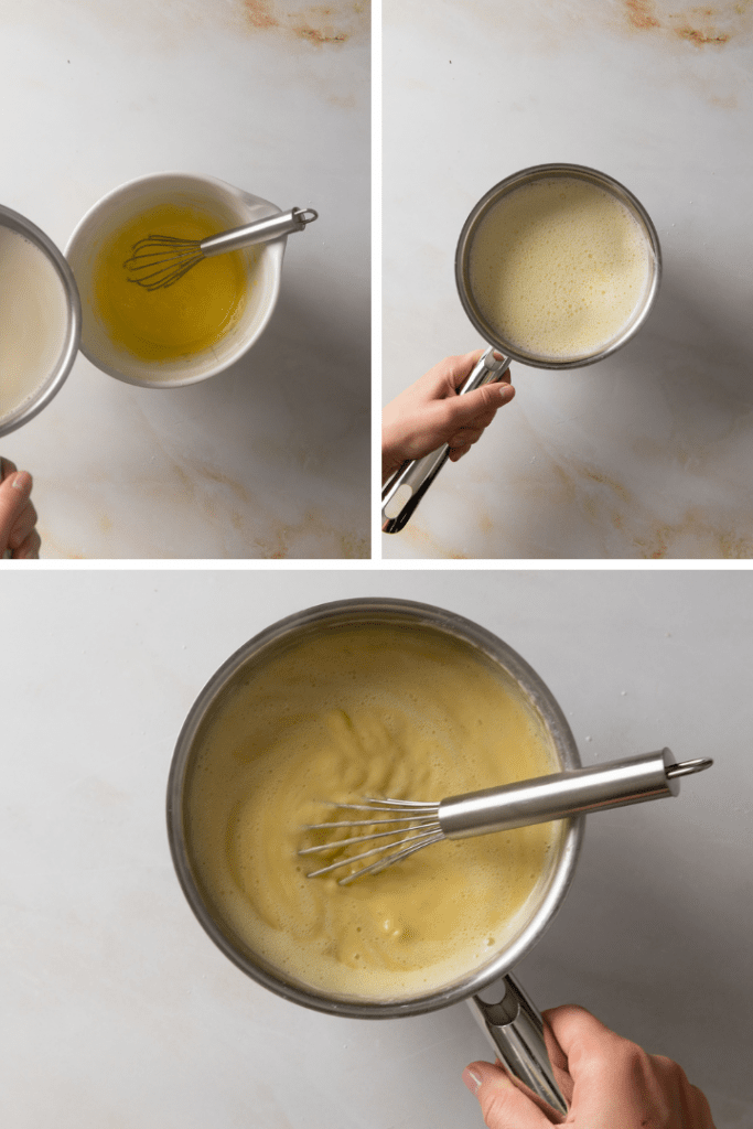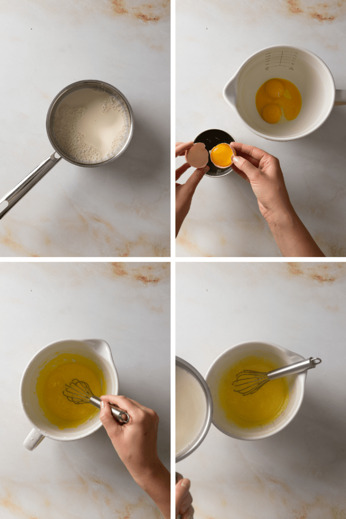 Zunächst wird der Pudding für die Füllung zubereitet. Dafür Eigelb, Zucker und Speisestärke in einer mittelgroßen Schüssel vermischen. Am besten geht das mit einem kleinen Schneebesen. Derweil in einem kleinen Topf die Milch zum kochen bringen. Vanilleextrakt bzw. Mark der Vanilleschote mit zur Eigelb-Mischung geben.