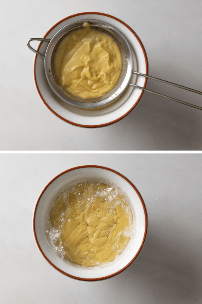 Pudding dann in eine saubere Schüssel füllen, Frischhaltefolie direkt auf den Pudding drücken und zunächst bei Raumtemperatur, dann im Kühlschrank abkühlen lassen bis der Pudding ganz erkaltet ist.