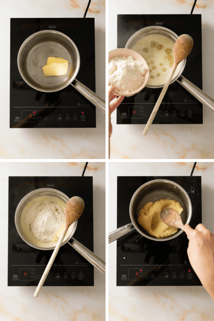 Backofen auf 200 °C Ober- und Unterhitze vorheizen. Wasser, Butter in Salz in einen mittelgroßen Topf geben, aufkochen lassen. Sobald das Wasser kocht das Mehl in einem Hineinstürzen und kräftig mit einem Holzlöffel umrühren. Was zunächst klumpig aussieht bildet sich bei stetigem Rühren binnen kurzen Zeit zu einer glatten Teigkugel. Am Boden bildet sich gleichzeitig eine weiße Schicht. Dies zeigt, dass der Brandteig fertig ist. Teig aus dem Topf nehmen, in eine Rührschüssel geben und kurz abkühlen lassen.