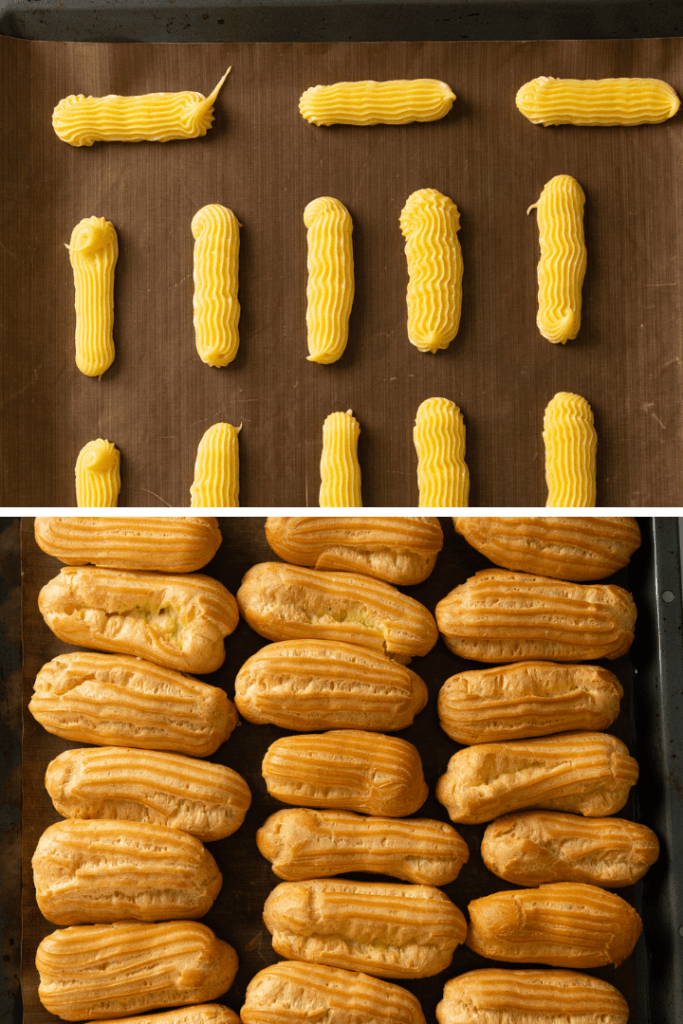 Im vorgeheizten Backofen bei 200 °C Ober- und Unterhitze etwa 25 Minuten backen bis die Eclairs goldbraun gebacken sind. Nach dem Backen komplett abkühlen lassen.
