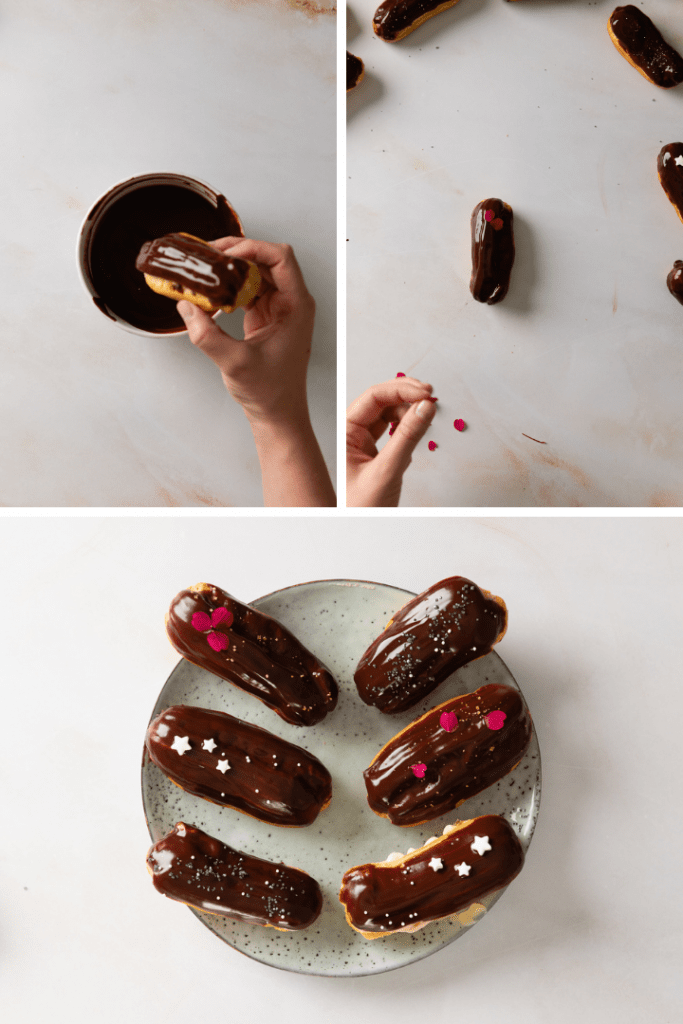 Für die Glasur Schokolade, Sahne und Cognac in eine kleinen Schüssel über dem Wasserbad oder in der Mikrowelle schmelzen. Glatt rühren und die Eclairs darin eintauchen. Dann nach Belieben mit essbaren Blüten, Streuseln usw. dekorieren. Bis zum Servieren in den Kühlschrank stellen.