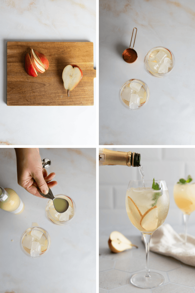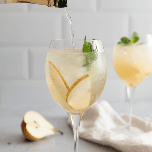Schneide die Birne in sehr schmale Streifen. Gib Birnensaft, Ingwersirup und Zitronensaft in ein Weißweinglas. Lege zwei Birnenscheiben an den Rand des Glases und Fülle es mit Eiswürfeln auf. Fülle das Glas dann mit Prosecco und Sodawasser auf und garniere den Drink mit einem Minzzweig.